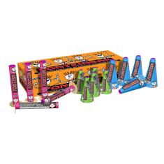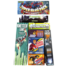 Een prachtig 52-delig superhelden CAT.1-vuurwerkpakket voor de jeugdige vuurwerkliefhebber! Met o.a. knetterlint, flitspaaltjes, flashing demon, sterretjes en knetter ballen...