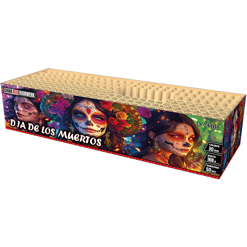 Een eerbetoon aan kleur, leven en vuurwerk! DIA DE LOS MUERTOS is een spectaculaire 168-schots compound en nieuw in het assortiment van China Red. Deze indrukwekkende compound combineert een hoge schotfrequentie, afwisselende effecten en een opvallende V-shape afvuring voor een visueel overweldigende show.