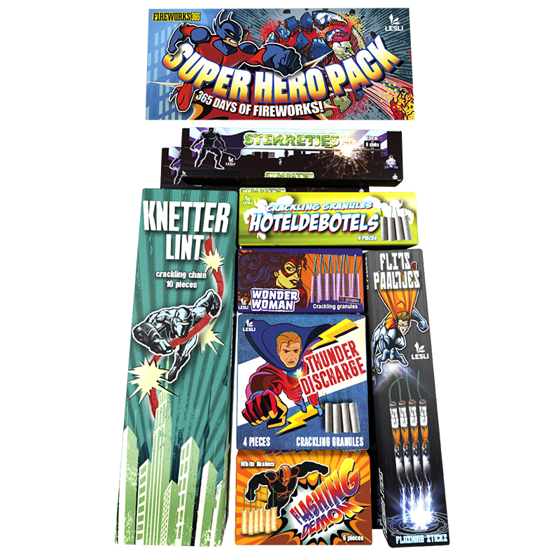 Een prachtig 52-delig superhelden CAT.1-vuurwerkpakket voor de jeugdige vuurwerkliefhebber! Met o.a. knetterlint, flitspaaltjes, flashing demon, sterretjes en knetter ballen...
