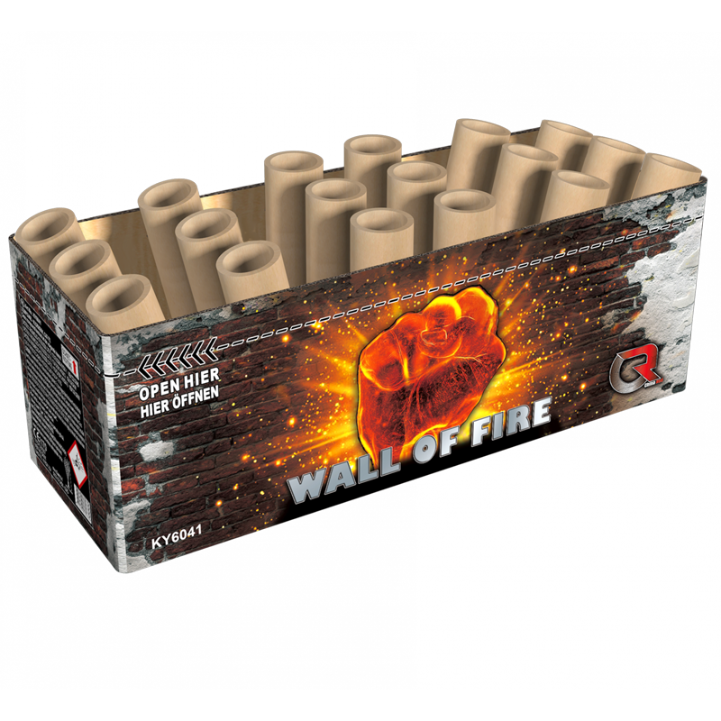 Compound van fonteinen met wisselende effecten, 3 spectaculaire rijen achter elkaar. 3 x een muur van vuur! Echt heel mooi!